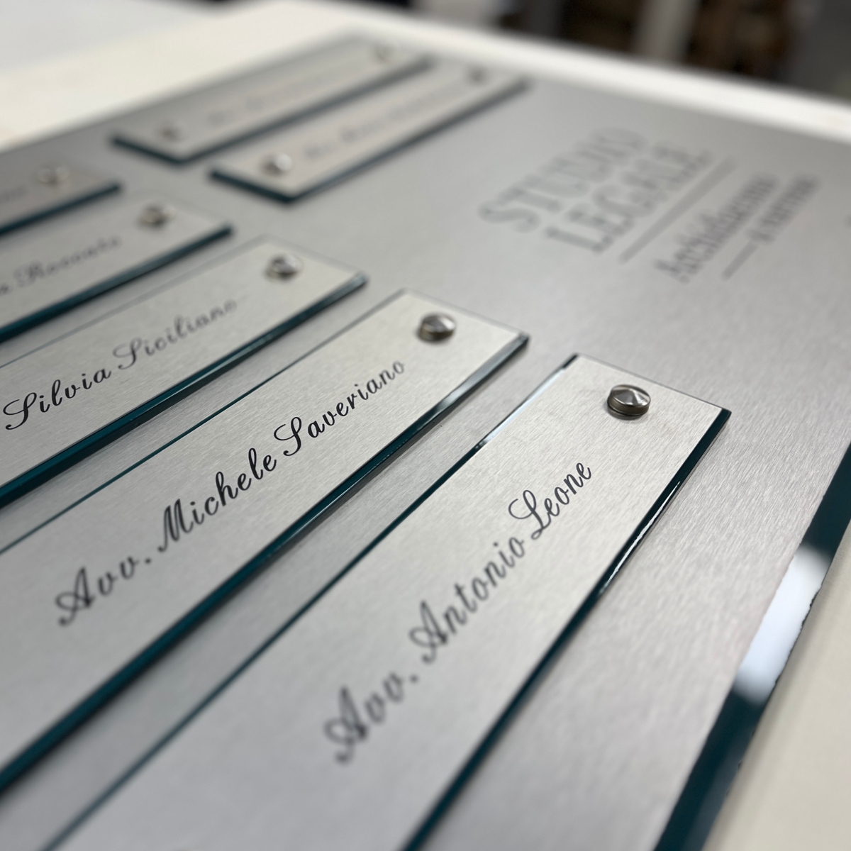Targa modulare realizzata per un STUDIO ASSOCIATO in alluminio anodizzato argento e plexiglass verniciato.Personalizzazione mediante stampa digitale diretta